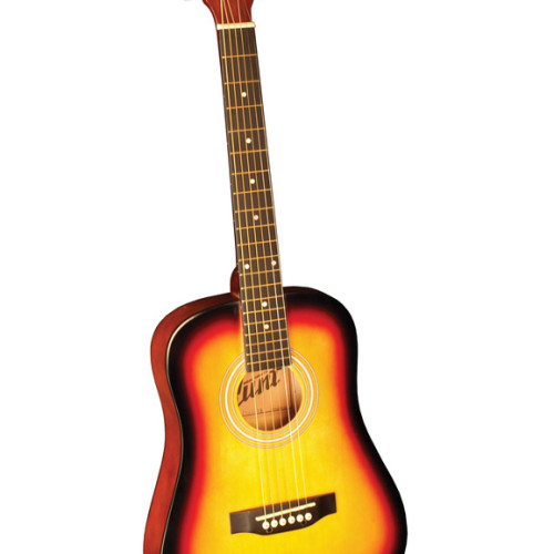 This guitar is my first acoustic, and while it isn't perfect, it is quite a nice piece of starter equipment. Let's start with some flaws; the fret wires on this guitar curve off towards the body on the lower side of the neck, and some had a bit of rust when I got mine (shipped via amazon). This really doesn't effect the playing of this guitar and is an aesthetic issue. The other big problem this guitar has is fret buzz, and it has a lot of it, especially towards the lower end of the neck. However, I imagine this issue could be solved with a setup adjustment, something that is a bit beyond my skill set, but won't be expensive at a local music shop. For these few minor flaws, this guitar answers with many great things. First, it's inexpensive. second, chords and high notes ring clear and true from this guitar. It stays in tune just fine if you don't knock it about, and isn't at all difficult of being put back in to tune when you do. With its small size comes a lot of portability, and it can be used easily by child and adult alike. For its low price and high portability, this guitar gets a high recommendation from me.
